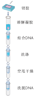 DNA產(chǎn)物經(jīng)瓊脂糖凝膠電泳分離后,切出所需的DNA片段,然后加入結(jié)合液溶解凝膠,溶解后轉(zhuǎn)移到HiBind®柱上離心吸附DNA,經(jīng)簡(jiǎn)單的洗滌后,用10-15µl無(wú)菌水洗脫DNA。純化的產(chǎn)物可用于T-A連接、PCR測(cè)序、酶切、各類(lèi)型的標(biāo)記反應(yīng)等。