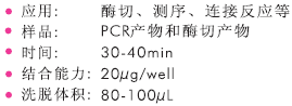 該試劑盒是采用96孔硅膠板純化方式,可高通量快速?gòu)?6個(gè)PCR產(chǎn)物中純化DNA,完成一次實(shí)驗(yàn)只需30-40分鐘。純化的DNA可直接用于自動(dòng)測(cè)序,酶切,連接,電轉(zhuǎn)等下游應(yīng)用。