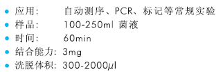 該試劑盒使用傳統的堿裂解法和磁珠純化方式相結合,適合于從200-250ml的菌液中純化1-2mg高純度的質粒DNA,以及 BACs, PACs、粘粒等大片段的質粒DNA。純化所得質??梢灾苯佑糜跍y序、標記、酶切等下游操作。